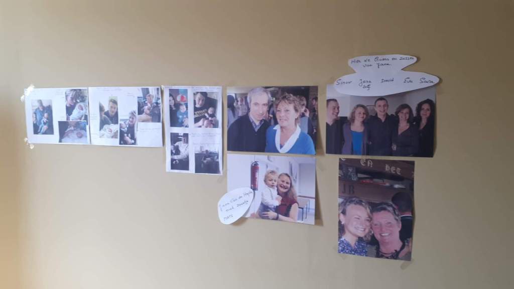 In die maand evolueerde iets moois. Mama haar zussen namen meer contact op. Ik denk dat haar opname in kortverblijf een shock is geweest voor een aantal van hen. Er werd elke dag met mama gebeld tijdens haar verblijf om te polsen hoe ze het stelde. Een zus vroeg: “Ik heb foto’s van ons gezin geplakt met de namen erbij. Is het stom als ik dit opstuur naar mama?” Maar nee! Integendeel! Dat is net een grote hulp voor mama. Nu hangen deze prachtige collages in mama haar kamer.